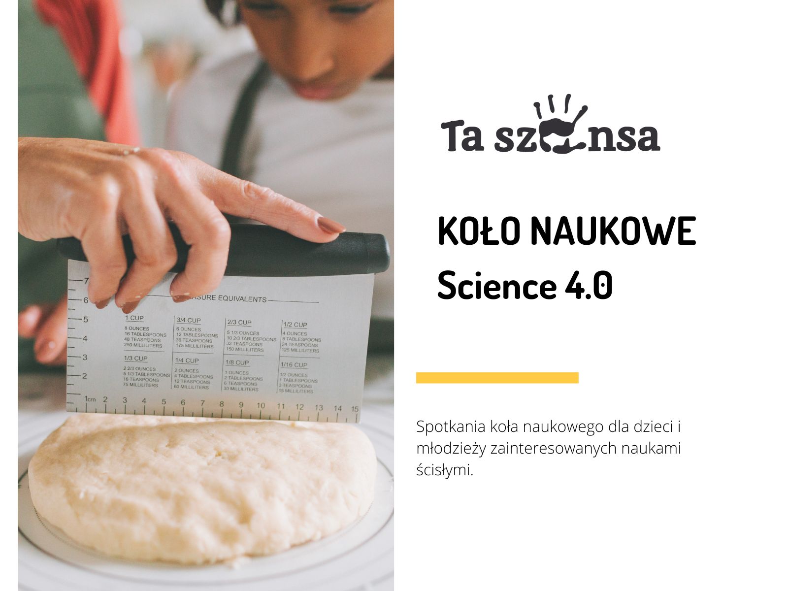 Zapraszamy serdecznie dzieci i młodzież zainteresowane naukami ścisłymi na spotkania Koła Naukowego SCIENCE 4.0. Spotkania będą odbywały się w wybrane soboty. Edukacja w zakresie zdrowych nawyków żywieniowych z wykorzystaniem wiedzy z nauk ścisłych i przyrodniczych. Zapraszamy będziemy gotować oraz eksperymentować. Zajęcia dedykowane są dla dwóch grup wiekowych (I grupa klasy I-IV, II grupa klasy V-VIII). Będziemy robić zdrowe ciasteczka.